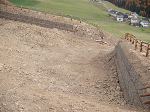 Nach einem Projekt und unter der Bauleitung von Julius Staffler vom Landesamt für Wildbach- und Lawinenverbauung West wurden die Ablenkdämme neu errichtet. Bis zu vier Meter hoch, sorgen die neuen Dämme für die nötige Sicherheit. "Um die Dämme möglichst unauffällig in die Landschaft zu setzen, haben wir nur bergseitig mit Drahtschotterkörben gearbeitet, während wir die Dämme auf der Talseite mit Erde aufgeschüttet und unregelmäßig gestaltet haben", so Staffler.