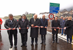 Bei einer Feierstunde konnten Durnwalder, Mussner und Tommasini heute nach dem 2007 eröffneten Tunnel St. Jakob einen weiteren Teil der Umfahrungsstraße, nämlich die Umfahrung von Steinmannwald, die zuvor von Dekan Jakob Willeit gesegnet wurde, für den Verkehr freigegeben.