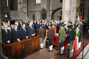 Mit den Angehörigen des Altlandeshauptmanns, politischen Weggefährten und höchsten politischen Vertretern aus Südtirol, seinen Nachbarländern, aus Wien und Rom sowie mit tausenden Gläubigen hat Bischof Golser heute den vom durch andere Bozner Chöre erweiterten Domchor musikalisch gestalteten Trauergottesdienst für Altlandeshauptmann Magnago gefeiert. "Das irdische Zelt des Altlandeshauptmanns ist nun abgebrochen worden", betonte Golser in Anlehnung an den Apostel Paulus und dessen in dem als Lesung vom ehemaligen persönlichen Referenten Magnagos, Karl Rainer, vorgetragenen zweiten Brief an die Korinther. Die Hoffnung sei, dass dieses irdische Zelt durch eine ewige Wohnung im Himmel ersetzt werde, so der Bischof.