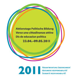 Politische Bildungsarbeit sichtbar machen und möglichst viele Personen zur Mitarbeit im politischen Bildungsbereich zu motivieren, ist das Ziel der Aktionstage Politische Bildung. Im Sinne des Mottos des Europarates "Education for Democratic Citizenship" sollen sie Demokratie und Menschenrechte, Partizipation und aktive Bürgerschaft stärken. Im deutschsprachigen Raum - in Deutschland, in Österreich und dem deutschsprachigen Teil Belgiens - haben die Aktionstage bereits eine mehrjährige Tradition, in Südtirol wurden sie vor vier Jahren erstmals veranstaltet, wobei sowohl bei den Veranstaltern als auch bei den Bürgern zunehmendes Interesse zu verzeichnen ist.