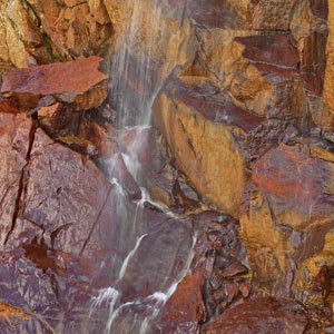 Eisenmineralien, die das Wasser des Rötlbachs in den Zillertaler Alpen aus den Schiefergesteinen löst, verleihen dieser zerklüfteten Felswand die ausgefallene Farbpalette von dunkelrot über orange und ockerfarben bis braun. © Bernhard Edmaier