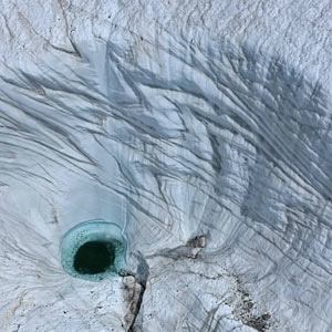Der Gornergletscher in den Walliser Alpen in der Schweiz ist der drittlängste Gletscher der Alpen. Er ist bekannt für die spektakulären blauen Bäche und Seen, die sich im Sommer auf seiner Eiszunge bilden. Schmelzwasser hat auch diese Wanne aus dem Eis heraus gelöst, an deren Wänden sich die inneren Fließstrukturen des Gletschers erkennen lassen. © Bernhard Edmaier