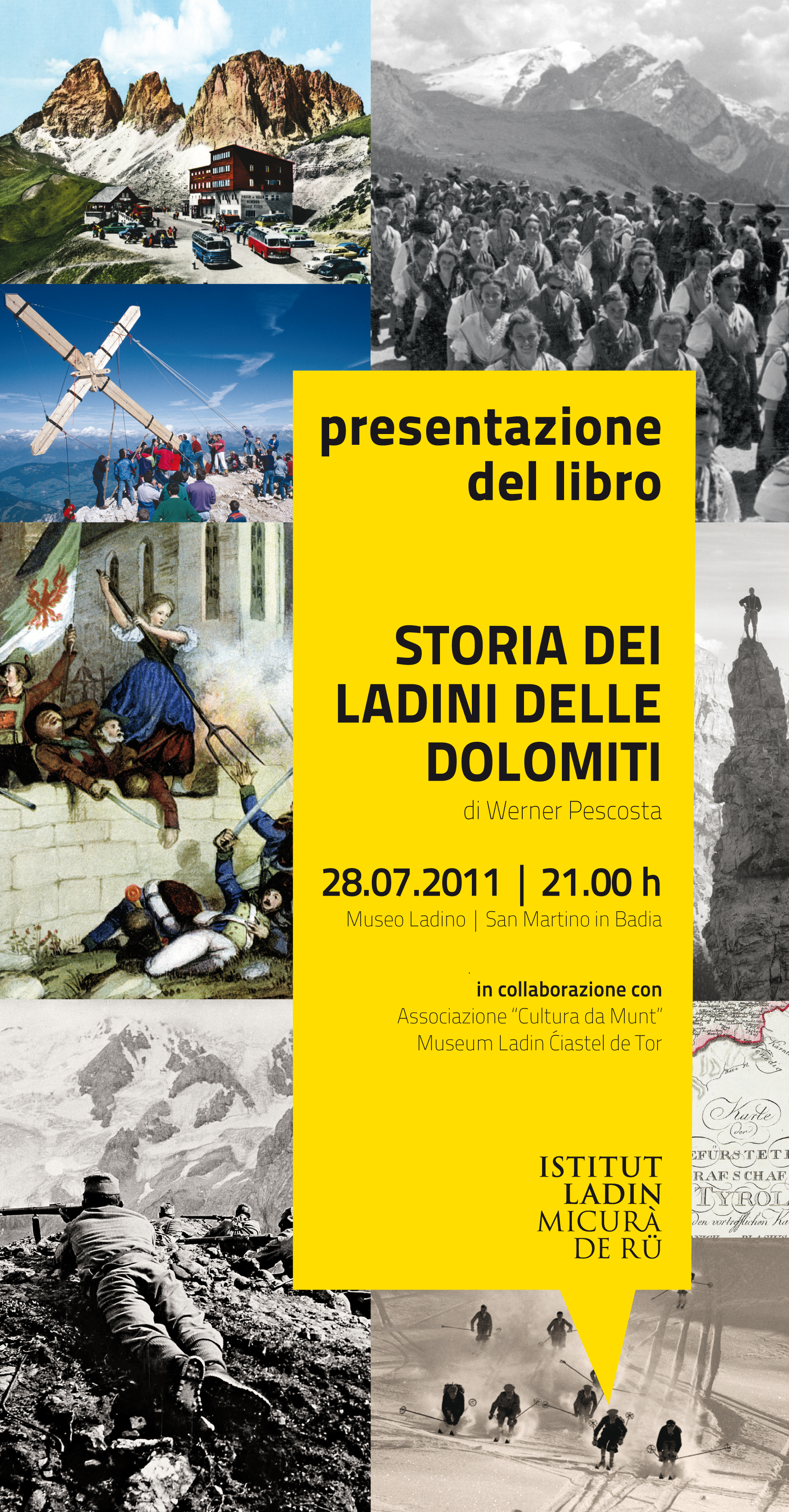 Werner Pescosta wird sein Buch mit dem Titel "Storia dei ladini delle Dolomiti" (Geschichte der Dolomiten-Ladiner) am Donnerstag, dem 28. Juli, um 21.00 Uhr im Museum Ladin Ciastel de Tor in St. Martin in Thurn vorstellen. Das Werk umfasst 760 Seiten mit 400 Fotografien, 33 historischen Karten, Dokumenten, Grafiken und Illustrationen. Bei günstigen Wetterbedingungen wird der Autor Auszüge und Fotos im Schlosshof vorstellen, andernfalls findet die Veranstaltung in den Innenräumen statt.