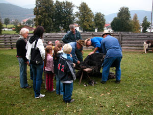 Das Angebot "Wolle und Schafschur" beinhaltet die Arbeitsschritte vom Scheren der Schafe über das Wollekämmen, das Spinnen und Weben bis zum fertigen Wollprodukt. Das Filzen eines kleinen Gegenstandes rundet die Führung ab.