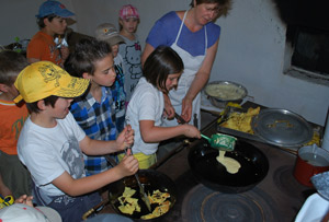 Die Themenführung "Kochen, essen, beten" bietet den Grund- und Mittelschülern einen Rundgang durch das Museum und beleuchtet dabei Essens- und Brauchgewohnheiten von früher und stellt sie den heutigen gegenüber. Das Kochen ohne Strom und fließendes Wasser in der "Rauchküche" gehörte zum Alltag. Am moderneren Sparherd können die Schülerinnen und Schüler zusehen, wie die Speisen zubereitet wurden und selbst ausprobieren, wie aufwändig Kochen früher war. Das Programm findet sich als PDF im Anhang; das Projekt "Kochen, essen, beten" wird auf Anfrage angeboten.