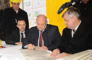 Anschließend unterzeichneten LH Luis Durnwalder, LR Christian Tommasini und LR Florian Mussner die Pergament-Urkunde zur Grundsteinlegung und mauerten sie in den Grundstein ein, der von Don Erminio Baldo gesegnet wurde.