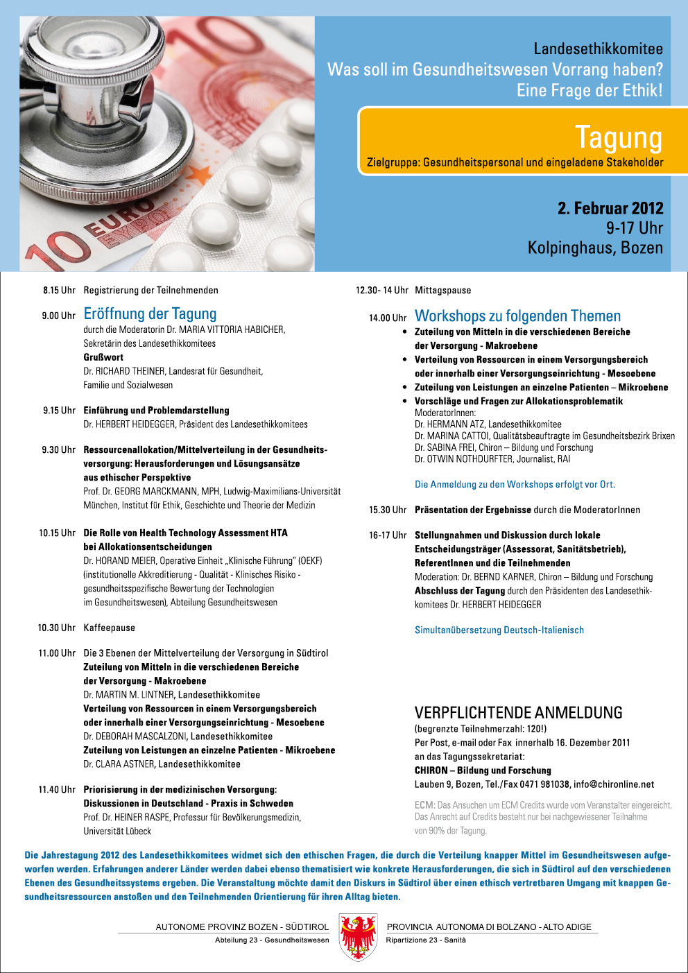 Wenn die Mittel im öffentlichen und solidarisch finanzierten Gesundheitsdienst knapp werden, welche Bereiche, welche medizinischen oder pflegerischen Leistungen sollen dann Vorrang haben? In seiner heurigen Jahrestagung stellt sich das Landesethikkomitee dieser und ähnlichen heiklen ethischen Fragen. Lösungsansätze und Erfahrungen anderer Länder werden dabei durch internationale und heimische Referenten ebenso behandelt wie die Herausforderungen, die sich aufgrund der aktuellen Sparzwänge in Südtirol für das Gesundheitswesen ergeben.