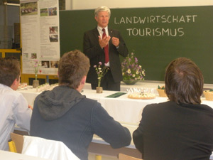 Landesrat Hans Berger wies auf die Bedeutung der Kenntnisse in den beiden Bereichen Landwirtschaft und Tourismus hin. So stellte er etwa den Schülerinnen und Schülern Fragen zur Herstellung von Milch und Fleisch und betonte, wie wichtig es sei, Antworten geben zu können; erst damit könne der Gast vom Produkt überzeugt werden.