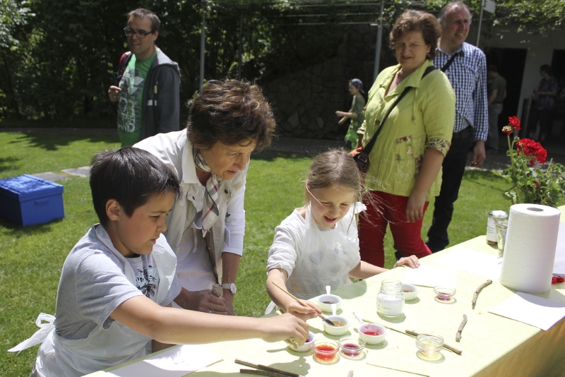 Die Mitmach-Station zur Faszination Pflanzenfarbe zeigte, dass Blüten nicht nur farbig und bunt sind, damit sie den Menschen gefallen: Die Farbe der Blüten lockt etwa Bienen an, welche die Pollen der Pflanze weiter tragen und so für Nachwuchs sorgen. Auch die Menschen finden weitere Verwendung für die bunten Blütenblätter und Farbstoffe der Pflanzen: in der Malerei. Vroni S. Meraner fertigte die ersten Trauttmansdorff Blumenbilder aus Naturfarben an; besonders die jungen Gartengäste taten es ihr nach und nahmen die selbst gemachten Blumenportraits als Erinnerung mit nach Hause.