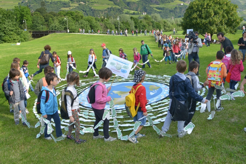 LPA - Voller Vorfreude eilt eine Kette aus Kindern zum Spielfest auf den Talferwiesen. Passanten bleiben stehen und fragen nach der Bedeutung des Bandes mit den Fußspuren aus Karton, welches die Kinder verbindet. Rund 200 Grundschulklassen mit 3.000 Kindern aus ganz Südtirol haben im Rahmen der Aktion KlimaSchritte 73.480 Kilometer Schulweg umweltfreundlich zurückgelegt und dabei fast 50.000 KlimaSchritte gesammelt. Heute (5. Juni) ist das Projekt abgeschlossen worden.