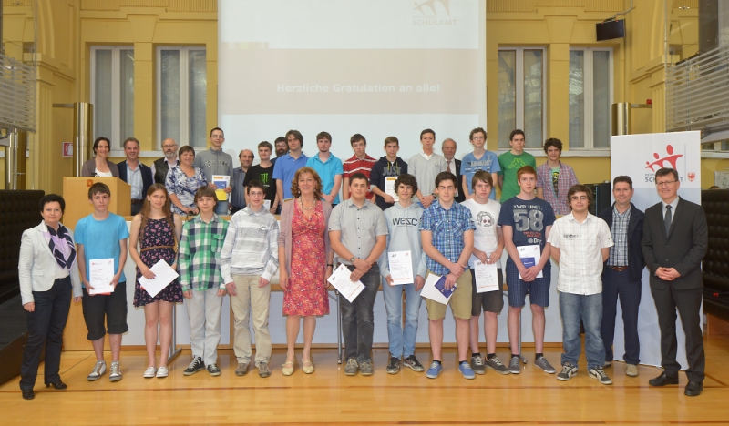 Alle Schüler, die sich auf den ersten Rängen platzieren konnten und alle, die 50 Prozent der Höchstpunktezahl erreicht haben, wurden nun von Bildungslandesrätin Kasslatter Mur und Schulamtsleiter Höllrigl prämiert.