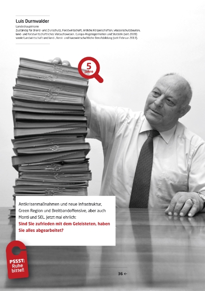 Einen Rückblick auf die ablaufende Legislatur und die Amtsperiode der Landesregierung bietet die soeben erschienene September-Nummer der Zeitschrift "Das Land Südtirol". In zahlreichen Graphiken und Schaubildern werden die wichtigsten Themenbereiche der Arbeit der Landesregierung abgehakt, Landeshauptmann und Landesräten wurde indes ein Maulkorb verpasst.