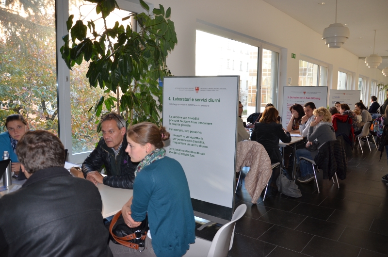 Gearbeitet wurde an neun Arbeitstischen zu den Themen Familie, Gesundheit, Schule und Ausbildung, Werkstätten und Tagesbegleitung, Arbeit, Wohnen, Freizeit-Mobilität-Barrierefreiheit, Inklusion und Diskriminierung sowie Teilhabe und Koordination. Jeder Arbeitstisch wurde jeweils von zwei Studentinnen und Studenten und unter der Gesamtleitung von Professorin Anna Aluffi Pentini von der Fakultät für Bildungswissenschaften der Universität Bozen und im Auftrag des Landesamtes für Menschen mit Behinderungen geleitet, zahlreiche Vorschläge zum neuen Gesetz wurden gesammelt. Vor allem die Bereiche Gesundheit, Wohnen und Arbeitseingliederung brennen den Betroffenen und ihren Angehörigen unter den Nägeln.