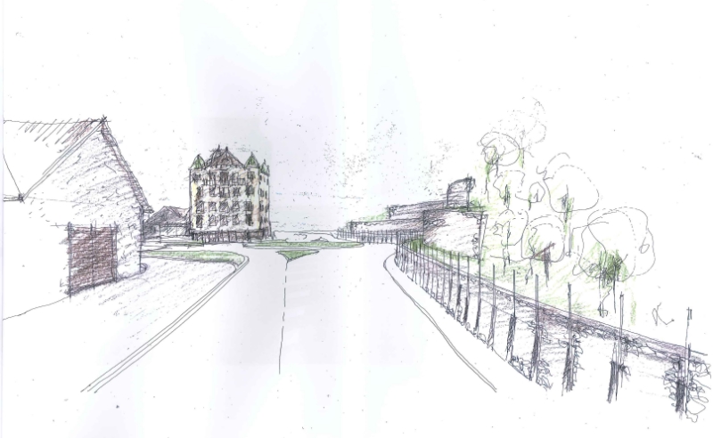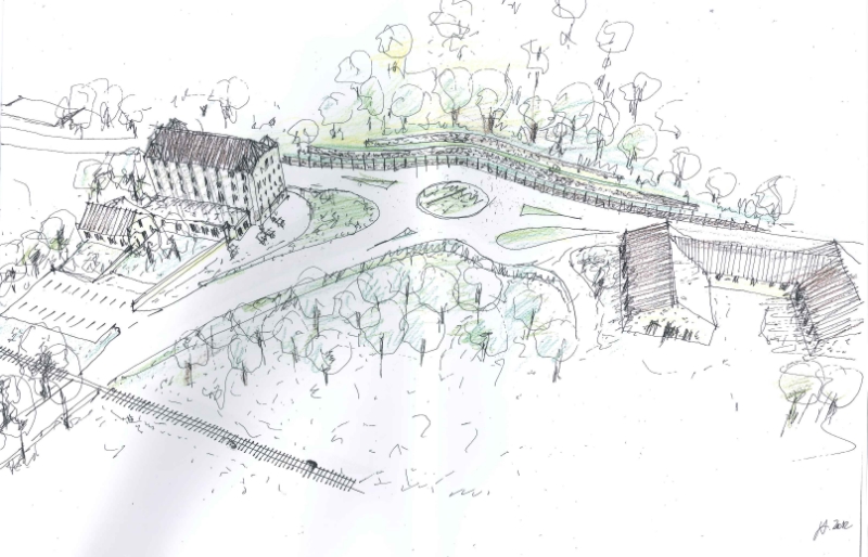 Die Kreuzung soll als Kreisverkehr gestaltet werden, wobei der Kreuzungspunkt um rund 25 Meter nach Osten verschoben wird. Zwei Abstufungen einer Natursteinmauer von jeweils zwei Metern Breite werden nach Fertigstellung der Arbeiten mit Sträuchern bepflanzt. Die Hauptverkehrsader soll im Kreuzungsbereich mit vertikal angeordneten Stäben abgegrenzt werden. Für die Verkehrsteilnehmer entsteht durch Geschwindigkeit und Perspektive eine geschlossene Wand, die zu Kreisverkehrsknoten hin niedriger und durch das Abbremsen transparent wird.