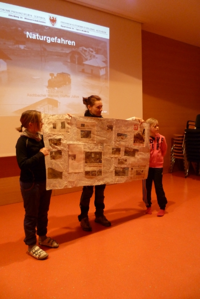 Aschbacher zeigte bei ihrem Vortrag Filme über den Lawinenabgang im Passeiertal und über den Murabgang 2012 in Virgen in Osttirol sowie Bilder von Überschwemmungen in Burgstall 1960, als die Eisenbahnlinie weggerissen wurde, vom Hochwasser in Bruneck, vom Hochwasser in Salurn 1981, vom Hangrutsch in Sottrù/Abtei 2012 sowie von den Überschemmungen und Muren im Pfitschertal 2012.