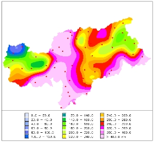 Im Etschtal, Überetsch, Eisacktal, Gröden, Gadertal, am Regglberg und in Teilen des Vinschgaus wurde seit Beginn der Wetteraufzeichnungen im Jahre 1921 noch nie so viel Niederschlag gemessen wie heuer. In Bozen hat es mit 381 Millimeter fünf Mal mehr geregnet und geschneit als üblich. Auch in den anderen Landesteilen ist drei bis vier Mal mehr Niederschlag gefallen als im langjährigen Durchschnitt. Verantwortlich dafür war eine ungewöhnlich stabile Großwetterlage. Der Alpenraum lag fast permanent in einer südlichen Strömung, die zu höchst unterschiedlichen Bedingungen beidseits der Alpen führte. Während es an der Alpennordseite relativ trocken blieb, zogen ein Dutzend Mittelmeertiefs über Südtirol hinweg. „Aufgrund der Südströmung wurden mit rund 100 Millimeter im Nordwesten, also im Reschengebiet die geringsten Niederschlagsmengen verzeichnet", erklärt der Meteorologe Dieter Peterlin. Im Winter 2011/2012 mit häufigen Nordstaulagen seien es hier doppelt so viel gewesen, so Peterlin.