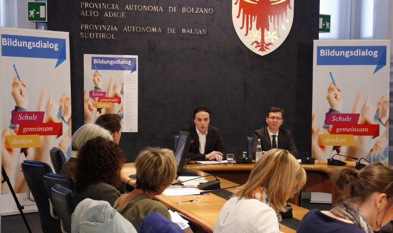 LPA - "Schule gemeinsam denken." Unter diesem Motto lädt der Landesrat für Deutsche Bildung, Kultur und Integration, Philipp Achammer, alle an Schule Beteiligten und Interessierten zum Bildungsdialog ein, um die gemeinsamen Leitlinien für die laufende Amtszeit zu definieren. Über das Wie und Wo haben Landesrat Achammer und Schulamtsleiter Peter Höllrigl heute (10. März) im Bozner Palais Widmann informiert.