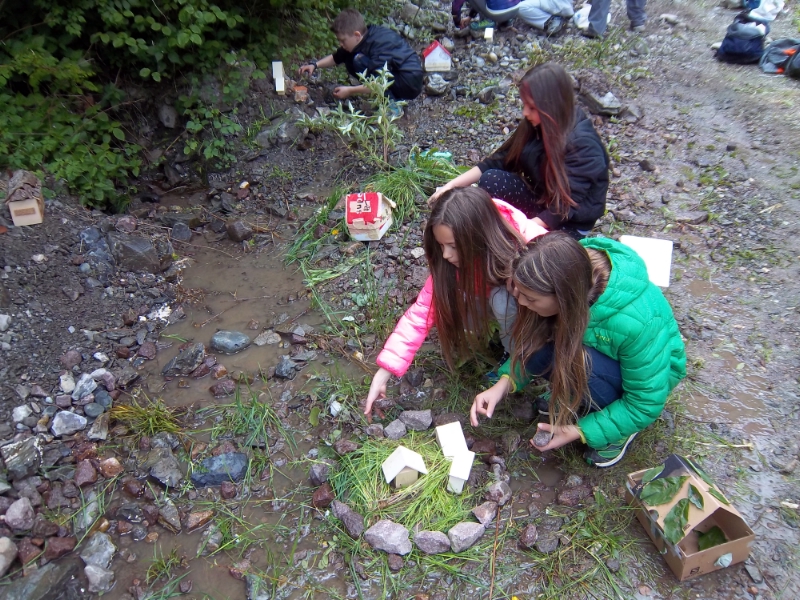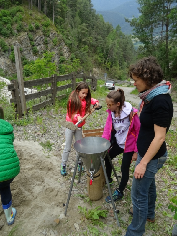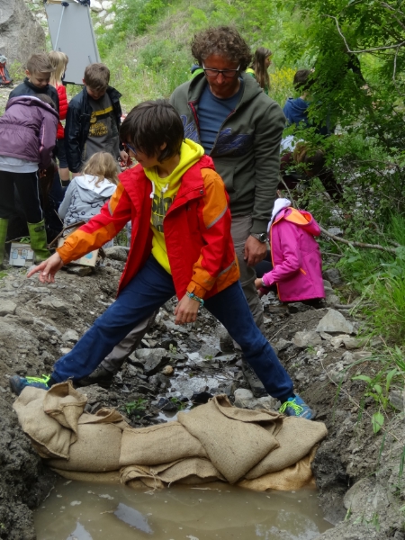 Dann wurde die Theorie in die Praxis umgesetzt: Mit Landschaftsarchitektin Marion Aschbacher und Gewässerokologen Peter Hecher von der Landesabteilung Wasserschutzbauten wurde an einem kleinen Wasserlauf neben dem Afererbach im Rückhaltbecken oberhalb des Dorfes Albeins die Erstellung eines Gefahrenzonenplanes erprobt. Die Schülerinnen und Schüler errichteten eine kleine Siedlung aus selbst gebastelten Häusern am Bach und erzeugten ein künstliches Hochwasser. Sie erstellten einen Gefahrenzonenplan und schätzten das Risiko ab, indem sie rote, blaue und gelbe Zonen einzeichneten. Ziel des Schulprojektes, erklärt Landschaftsarchitektin Aschbacher, war es, die Schülerinnen und Schüler mit dem Thema Naturgefahren vertraut zu machen und spielerisch den Gefahrenzonenplan zu veranschaulichen. Dabei, betont die Expertin, war es wichtig, den Bach nicht als gefährlich und bedrohlich darzustellen, sondern den Kindern auch zu vermitteln, wie viel Spaß es bereitet, am Bach zu bauen und zu spielen. Im Umgang mit der Natur ist jedoch Respekt wichtig, der richtige Umgang mit Naturgefahren ist grundlegend, um in Einklang mit der Natur leben zu können.