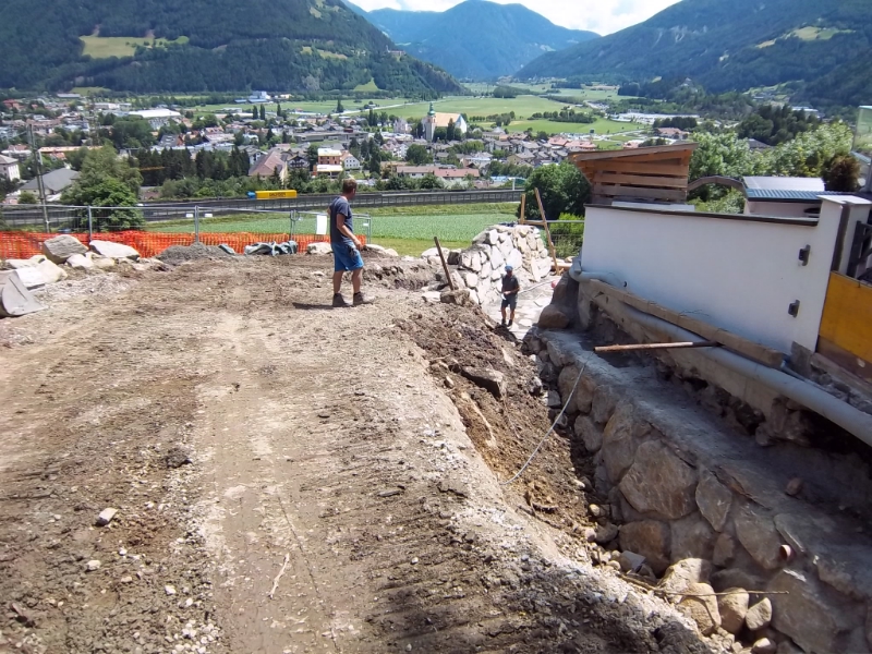 Um diese Gefahrensituation zu entschärfen, baut das Amt für Wildbach- und Lawinenverbauung Nord der Landesabteilung Wasserschutzbauten seit Anfang Mai dieses Jahres in Thuins oberhalb der Brennerautobahn an einer Rückhaltesperre, die künftig bei einem Unwetter an die 4800 Kubikmeter Material zurückhalten soll.