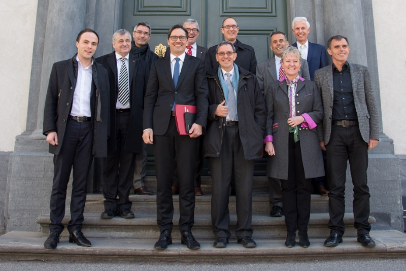 LR Philipp Achammer, LR Florian Mussner, Regierungsrat Mario Cavigelli, LH Arno Kompatscher, Regierungsrat Jon Domenic Parolini, Regierungspräsident Martin Jäger, Regierungsrat Christian Rathgeb, Abteilungsleiter Klaus Luther, Regierungsrätin Barbara Janom Steiner, Kanzleidirektor Claudio Riesen, LR Richard Theiner (von links).