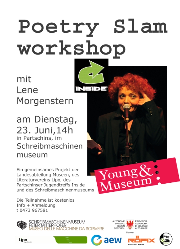 Die Teilnahme ist kostenlos. Anmelden können sich die Jugendlichen bis zum 21. Juni unter der Telefonnummer 0473 967581. Die Veranstaltung im Schreibmaschinenmuseum ist ein gemeinsames Projekt der Landesabteilung Museen, des Literaturvereins Lipo, des Partschinser Jugendtreffs Inside und des Schreibmaschinenmuseums.