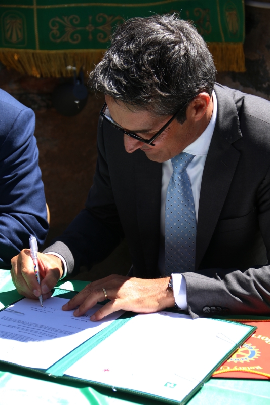 Landeshauptmann Kompatscher erläutert die Wichtigkeit der Protokoll-Unterschrift am Stilfserjoch