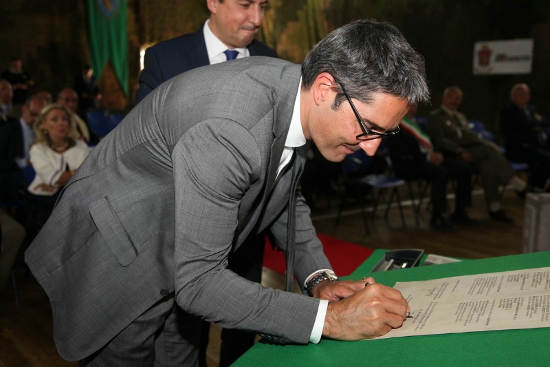 Landeshauptmann Arno Kompatscher hat heute Vormittag im Offizierskasino in Meran gemeinsam mit dem Staatssekretär im Verteidigungsministerium, Gioacchino Alfano, und dem Direktor der Agentur für Staatsgüter, Roberto Reggi, ein ergänzendes Abkommen zur Tauschvereinbarung Militär-Land und zur Übergabe der Kaserne "Mercanti" in Eppan unterzeichnet.