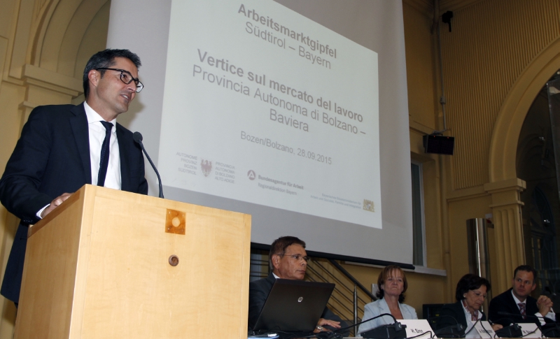"Der Arbeitsmarktgipfel bietet die Gelegenheit, die Arbeitsmarktexperten und Verantwortlichen der Bundesagentur für Arbeit aus Bayern kennen zu lernen, sich auszutauschen und sich über die jeweiligen Arbeitsmärkte zu informieren. Kein Arbeitsmarkt kann heute mehr innerhalb der engen Landesgrenzen oder staatlichen Grenzen funktionieren, das erlebt insbesondere Deutschland bzw. das wirtschaftlich sehr starke Bayern gerade aktuell", nahm Landeshauptmann Arno Kompatscher bei der Eröffnung des Arbeitsmarktgipfels Stellung.