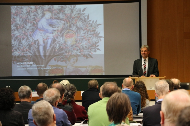 Landwirtschaftslandesrat Arnold Schuler spannte den Bogen vom Zufallssämling aus dem Garten der Großmutter Smith in Australien bis zu den Clubsorten. Es gelte, unterstrich er, auch im Bereich des Apfelanbaus die Vielfalt zu retten. In der Laimburg sind 120 Sorten erhalten. Und in der Nähe der Fragsburg wird ein Garten angelegt mit ein paar Dutzend Bäumen mit einem Dutzend alter Sämlingssorten. Im Projekt Apfel-Fit des Versuchszentrums Laimburg, führte er aus, werden 540 Sorten nicht nur geprüft, sondern auch molekulargenetisch abgesichert.