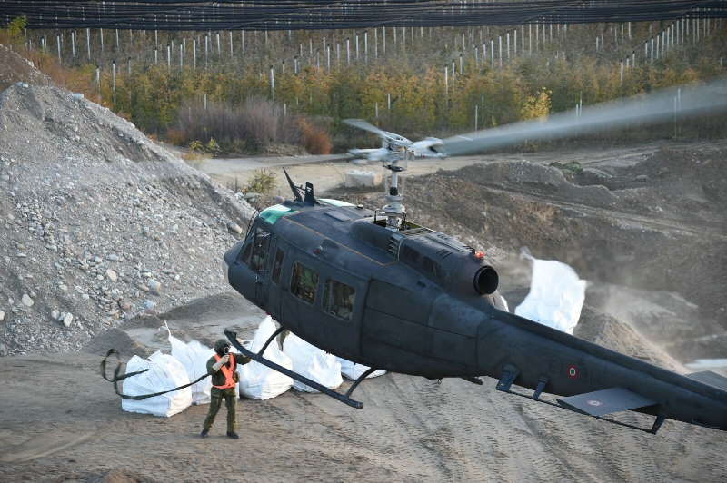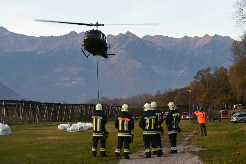 Um die Schadensstelle am Damm zu befestigen, füllt die Freiwillige Feuerwehr beim Schotterwerk Beton Lana in Lana Sandsäcke. Diese werden in sieben großen Nylonsäcken verstaut; jeder dieser Big Bags fasst an die 600 Kilogramm Sand. Da der Schadensort an der Falschauer schwer zugänglich ist, wird ein Hubschrauber angefordert, der auch über ein Nachtsichtgerät verfügen sollte.