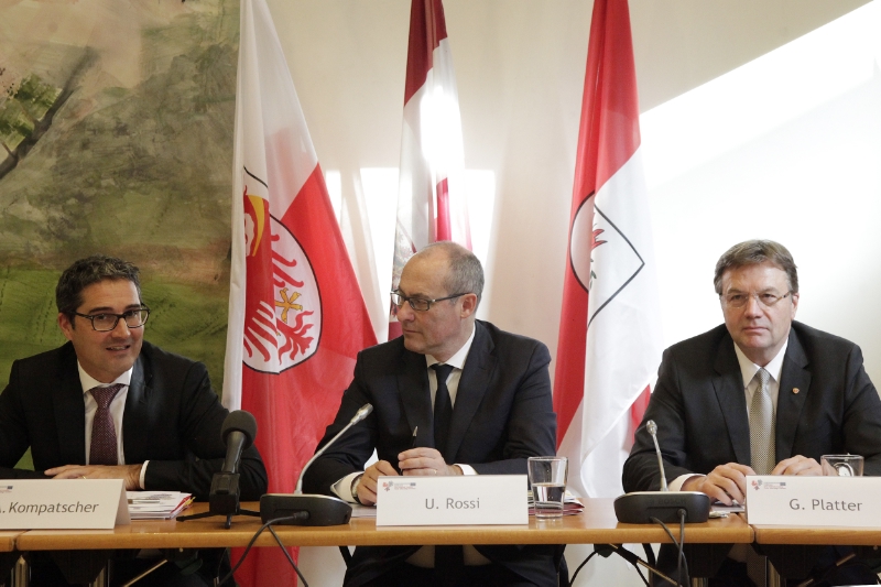 Zu seiner zehnten Sitzung ist heute (18. November) in Brüssel der Vorstand des EVTZ "Europaregion Tirol-Südtirol-Trentino" zusammengetroffen, zu ihrer achten die Versammlung. Geprägt waren die Sitzungen zum einen noch von den Ereignissen in Paris, vor deren Hintergrund die Zusammenarbeit in Europa noch stärker an Bedeutung gewinne, wie die drei Landeshauptleute Arno Kompatscher, Günther Platter und Ugo Rossi betonten, zum anderen vom 20-jährigen Jubiläum der Gemeinsamen Vertretung von Tirol, Südtirol und Trentino im Herzen Europas, und schließlich vom Wechsel an der EVTZ-Spitze: Mit heute übernimmt nach dem zweijährigen Rotationsprinzip das Trentino vom Land Tirol die Präsidentschaft. Damit wurde offiziell der Trentiner Landeshauptmann Ugo Rossi als neuer Präsident der Europaregion vorgestellt. Er nutzte gleich die Gelegenheit, ein Resumee über das abgelaufene Tätigkeitsjahr zu ziehen und die Initiativen und Projekte der Europaregion Tirol-Südtirol-Trentino für das kommende Jahr 2016 vorzustellen. Hauptsächliche Aktionsbereiche sind demnach Bildungs- und Forschungswesen, Umwelt und Mobilität. "Unser gemeinsames Ziel ist es, Wohlstand und Wohlbefinden in der Europaregion zu stärken, dazu zählen nicht nur Wirtschaft und Innovation sondern auch eine gesunde Umwelt und die Mobilität", so Landeshauptmann Rossi.