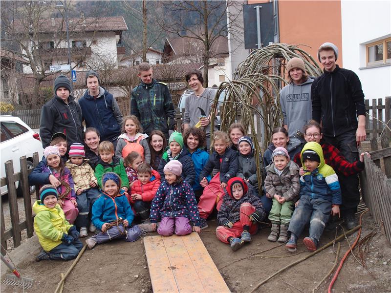 Mit dem selbstgewonnenen Material wurde im Kindergarten in Plaus ein lebendes Weidenhaus gebaut, das im Laufe des Frühjahrs anwachsen und den Kindern viele Spielmöglichkeiten eröffnen wird. Die Kindergartenkinder konnten es kaum abwarten, das neue Haus zu erobern und unterstützten die Schüler der Fachschule Laimburg tatkräftig.