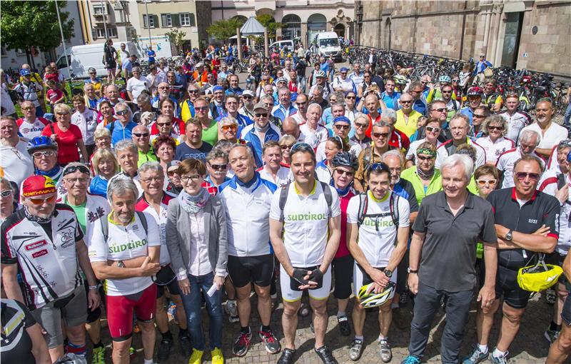 200 Radlerinnen und Radler zwischen 23 und 79 Jahren aus Bayern Tirol, Südtirol und dem Trentino sind heute von Brixen kommend auf dem Pfarrplatz in Bozen zusammengetroffen und etwa eine Stunde später nach Meran aufgebrochen; der Anteil der Frauen liegt bei 35 Prozent. Die Euregio-Alpen-Radtour begann am 29. Mai am Chiemsee und endet nach 500 Kilometern und sieben Tagen am Gardasee. Begleitet wird die Tour vom Bayerischen und Österreichischen Rundfunk. Das Motto, hieß es, sei "tagsüber radeln, abends feiern".
