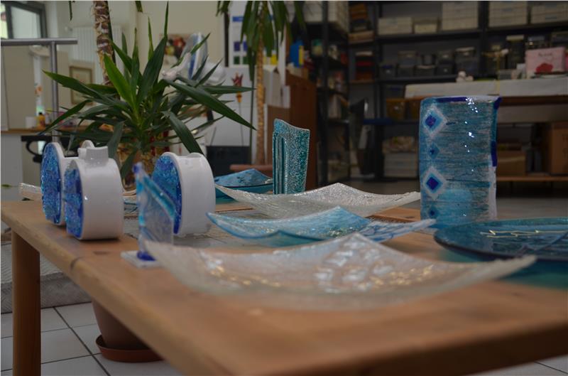 Aus Glas, Keramik und Stoff entstehen in der Sozialgenossenschaft Kaleidos kleine Kunstwerke: LRin Stocker konnte sich bei einem Besuch davon überzeugen.