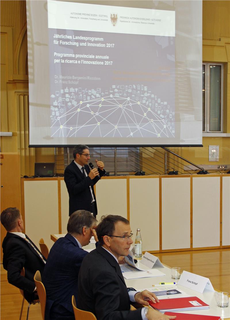 Der Leiter der Landesabteilung Innovation, Forschung und Universitäten, Maurizio Bergamini Riccobon, präsentierte im Anschluss das Landesprogramm für Forschung und Innovation 2017 und wies in seinen Ausführungen auf die Weiterführung der bisherigen Investitionen in Wissenschaft, Forschung und Innovation in Form von Förderungen hin. Mit 78 Millionen Euro wird die Forschungsarbeit der Freien Universität, der Eurac, des Wasserstoffzentrums H2 Südtirol, Fraunhofer Italia und Eco Research finanziert. Mit der fortlaufenden Stärkung der Forschungsaktivitäten rückt Südtirol wieder ein Stück vor im Bestreben, bei Forschung, Entwicklung und Innovation gegenüber den EU-Zielen aufzuholen.