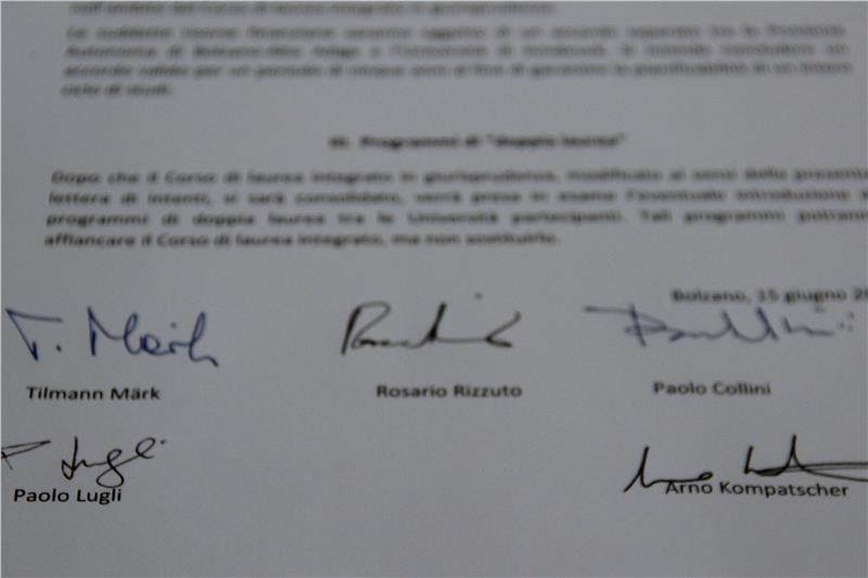 Das Abkommen zwischen den Universitäten von Innsbruck, Padua, Trient und Bozen zum neuen Integrierten Studium des Italienischen Rechts ist unterzeichnet.