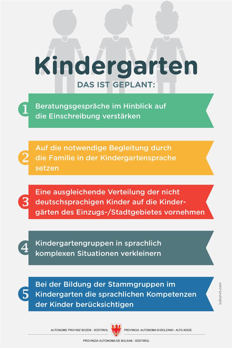 Das von Landesrat Achammer vorgestellte Konzept sieht mehrere Handlungsebenen vor, die im Kindergartenjahr 2018/19 zum Tragen kommen. Insbesondere soll die Beratung der Familien im Zuge der Einschreibung weiter gestärkt werden. Alle Familien, die ein Kind im entsprechenden Alter haben, werden für Anfang Dezember des Jahres vor der Einschreibung zum Tag der offenen Tür in den Kindergarten eingeladen. Eltern, die die Sprache des Kindergartens nicht sprechen, werden bei dieser Gelegenheit auf die Anforderungen an die Familien bei der Begleitung der Kinder aufmerksam gemacht. Die Familien werden auch darauf hingewiesen, dass ihnen ein Kindergartenplatz in einem der verschiedenen Kindergärten des Einzugs- bzw. Stadtgebietes zugeteilt werden kann, um eine möglichst gleichmäßige Verteilung zu gewährleisten.