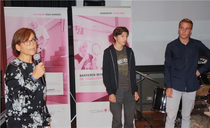 "– Barrieren + Lebensqualität“ - unter diesem Motto stand heute (13. Oktober) die Abschlussveranstaltung der Sensibilisierungskampagne "Barrierefrei - ich bin dabei", die das Landesressort für Gesundheit und Soziales gemeinsam mit dem Dachverband für Gesundheit und Soziales, dem Blindenzentrum, dem Gehörlosenverband, der Arche, der Sozialgenossenschaft IndependentL. und dem Elternverband gehörloser Kinder vor drei Jahren gestartet hatte, um auf architektonische Barrieren aufmerksam zu machen. An der Kampagne beteiligt waren auch die Oberschulen für Bauwesen "Peter Anich" und "A. e P. Delai". Gemeinsam mit den Schülerinnen und Schülern jener Klassen, die sich mit dem Thema Barrierefreiheit beschäftigt haben und ihren jeweiligen Fachlehrerinnen sowie den Direktorinnen Ingrid Keim und Paola Burzacca und mit der Direktorin des Amtes für Menschen mit Behinderung, Luciana Fiocca, zog Sozial- und Gesundheitslandesrätin Martha Stocker heute Bilanz.