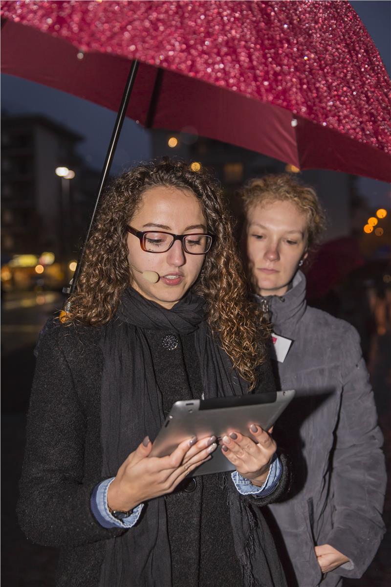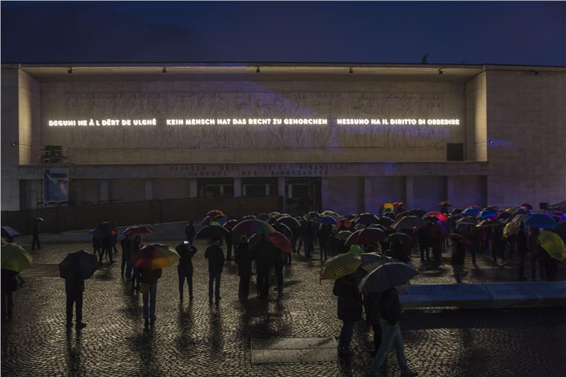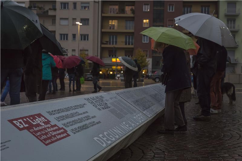 Das Relief am Finanzgebäude in Bozen war als "Haus des Faschismus" nach den Plänen der Architekten Paolo Rossi und Luis Plattner errichtet und 1942 fertiggestellt worden. An der Stirnseite befindet sich das monumentale Relief des Klausener Künstlers Hans Piffraders, das den Leitspruch der italienischen Faschisten "Credere, obbedire, combattere" ("Glauben, gehorchen, kämpfen") wiedergibt. Auf der Grundlage eines vom Land Südtirol 2011 ausgelobten Ideenwettbewerbs wurde das Relief nun neu gestaltet. Unter knapp 500 Vorschlägen entschied sich die Jury für das Projekt der beiden Künstler Arnold Holzknecht und Michele Bernardi. Sie wollen mit ihrem Projekt und der Lichtschrift mit dem Zitat von Hannah Arendt das faschistische Relief umdeuten. Diese Neugestaltung und Umdeutung des Denkmals wurde heute gefeiert. Jugendliche der drei Sprachgruppen rezitierten bei der Feier am Gerichtsplatz Passagen aus "Schöne Welt, böse Leut" von Claus Gatterer, aus "Unvergessen" von Franz Thaler, aus "Se questo è un uomo" von Primo Levi sowie das Hannah-Arendt-Zitat, das nun vor dem Relief leuchtet. Nach einer Schweigeminute wurde vor dem Hintergrund der Klänge des Haydn-Orchesters der Schriftzug illuminiert. Am Gerichtsplatz steht nun zudem eine Stele mit Informationen zu Denkmal und Geschichte.