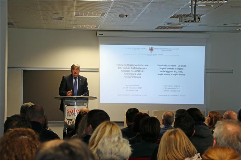 "Ich hatte fünf Gläser Wein getrunken und konnte nicht mehr reden, aber ich konnte noch gerade gehen und hatte das Gefühl, ich kann auch noch Autofahren", berichtete Verkehrspsychologe Max Dorfer über seinen eigenen Fahrversuch, den er unter der Kontrolle des österreichischen Kuratoriums für Verkehrssicherheit durchgeführt hat. Dabei zählte er den Kontrollverlust durch Alkoholkonsum neben dem zu schnellen Fahren als wichtigen strafverschärfenden Umstand auf, den das neue, am 24. März 2016 in Kraft getretene Gesetz über die Tötung im Straßenverkehr beinhaltet. Um dieses Gesetz im Speziellen und das Sichere Fahren im Allgemeinen sowie Alkohol am Steuer ging es bei der Tagung des Mobilitätsressorts des Landes am heutigen Montag (20. November) im Safety Park. Über 100 Teilnehmer nahmen an der Veranstaltung in Pfatten teil.