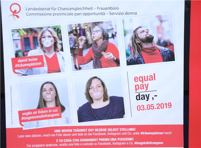 In Südtirol werden Frauen im Durchschnitt um 17,2 Prozent geringer entlohnt als ihre männlichen Kollegen mit derselben Qualifikation und Berufserfahrung. Frauen erreichen durchschnittliches Jahreseinkommen von 20.888 Euro, während dieses bei Männern 38.125 Euro beträgt. Im Fachjargon bezeichnet man dieses Phänomen als Gender Pay Gap, also als geschlechterspezifisches Lohngefälle. Der Equal Pay Day am 3. Mai 2019 soll auf diese und weitere Ungleichheiten zwischen Frauen und Männern hinweisen und die Gesellschaft dafür sensibilisieren. Heute (29. April) wurde das diesjährige Motto, die Sensibilisierungskampagne und die Aktionen dieses besonderen Tages vom Beirat für Chancengleichheit in Bozen vorgestellt.