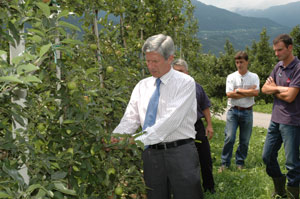 LPA – Auf einer Fläche von rund tausend Hektar ist das Obst im Etschtal durch den gestrigen Hagelschlag in Mitleidenschaft gezogen worden. Der Landesrat für Landwirtschaft, Hans Berger, hat sich heute Nachmittag im Gebiet von Gargazon, Niederlana und Völlan ein Bild über die entstandenen Schäden gemacht. Im betroffenen Gebiet ist 30 bis 90 Prozent der Tafelware beschädigt. Die öffentliche Hand werde im Rahmen ihrer Möglichkeiten helfen, sagte Landesrat Berger.