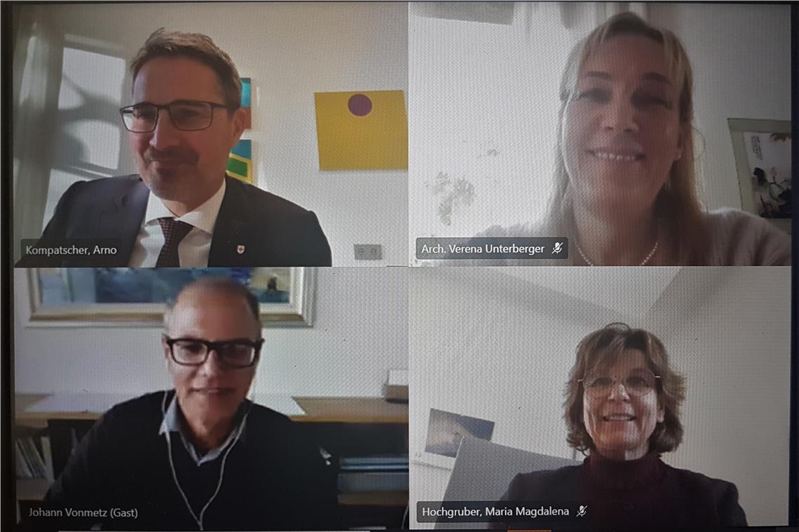 Videocall tra il presidente della Provincia Arno Kompatscher, l’assessora al territorio e paesaggio Maria Hochgruber Kuenzer e i vertici dell’Ordine degli architetti. Tema portante del confronto la proposta di istituire in Alto Adige una Casa dell'architettura, come quelle esistenti in Austria. Altri temi affrontati si riferiscono alla legge territorio e paesaggio. La delegazione dell’Ordine degli architetti era composta dal presidente Johann Vonmetz, dalla sua vice, nonchè presidente di arch.academy, Verena Unterberger e dal presidente della Fondazione, Carlo Calderan.