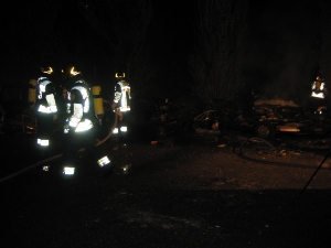 BF BZ - VVF - BZAm Donnerstag, den 25.08.2005 um 22.30 Uhr wurde die Berufsfeuerwehr Bozen zu einem Brand in der Nomadensiedlung am linken Eisackufer gerufen. Als die Einsatzkräfte am Einsatzort ankamen, standen fünf Wohnwagen, vier PKW's, zwei Mülltonnen, vier Bäume sowie herumliegender Müll in Brand. Die vom Brand betroffen Wohnwagen waren glücklicherweise abseits der Nomadensiedlung posizioniert und unbewohnt, es waren also zu keinem Zeitpunkt Menschen in Gefahr. Immer wieder explodierende Gaskartuschen erschwerten den Löscheinsatz der Feuerwehrmänner. Nach ca.einer Stunde war der Brand schliesslich unter Kontrolle, die Nachlöscharbeiten dauerten weitere 30 min. an. Neben der Berufsfeuerwehr Bozen waren die Polizei und das Weisse Kreuz im Einsatz.