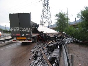 Zugmaschine und mit Eisenrohren beladener Sattelauflieger kippt in der MEBO Einfahrt in Bozen um.
