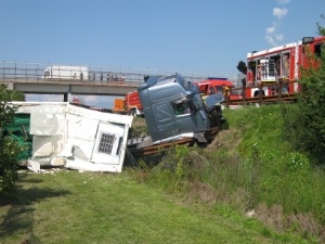 Auf der Südspur der Brennerautobahn hat sich heute Nachmittag, gegen 15 Uhr bei km 108 ein Verkehrsunfall zwischen einem VW Sharan und einem LKW ereignet. Während die Insassen beider Fahrzeuge nahezu unverletzt blieben, erlitten sowohl der PKW als auch der LKW, welcher in die nebenliegende Obstwiese stürzte, Totalschaden. In Folge des Unfalls trat aus dem LKW Treibstoff aus, die Feuerwehren brauchten ungefähr eine Stunde um den auslaufenden Treibstoff des LKW's umzupumpen bzw. aufzusaugen.