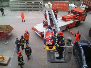 Der mittelschwer verletzte Arbeiter wurde vom Rettungsdienst versorgt und anschließend von der Feuerwehr mittels Drehleiter aus der misslichen Lage gerettet.