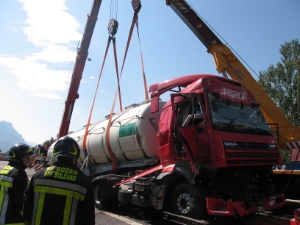 Am 14. September 2011 um 10:30 rückte die Kranmannschaft der Berufsfeuerwehr Bozen zu einem schweren LKW-Unfall auf der Nordspur der Autobahn A22, Km 102, aus. Insgesamt waren 4 Fahrzeuge im Unfall verwickelt: 2 Personenkraftwagen, ein LKW mit Anhänger, und ein Sattelzug. Die größten Schäden erlitt der Sattelzug und sein Fahrer, der in seiner Fahrerkabine, mit schweren Verletzungen für ca. 40 Minuten eingeklemmt blieb.