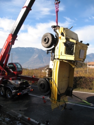 Auf Anforderung der Freiwilligen Feuerwehr Montan wurde die Kranmannschaft der Berufsfeuerwehr Bozen am heutigen Vormittag zu einem Unfall auf die SS 48 gerufen. Ein Unimog hatte sich überschlagen und war auf dem Dach liegen geblieben. Nach einer ersten Erkundung wurde das Kranfahrzeug und der Rüstwagen der Berufsfeuerwehr in Position gebrach und das Unfallfahrzeug geborgen. Während des Einsatztes mußte die Straße für ungefähr eine halbe Stunde komplett für den Verkehr gesperrt werden. Die Unfallerhebungen wurden von den Carabinieri durchgeführt.