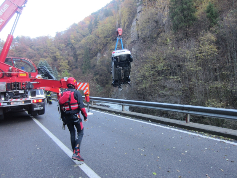 Foto BZBZGegen 08:30 des 13.11.2012 wurden die Wasserretter und die Kranmannschaft dieser Berufsfeuerwehr zusammen mit den örtlichen Freiwilligen Feuerwehren von Asfeld und Sarnthein, sowie Einheiten der Südtiroler Wasserrettung und Bezirkstaucher der Freiwilligen Feuerwehr zu einem Verkehsunfall ins Sarntal gerufen. Kurz vor Halbweg kam ein Fahrzeug aus ungeklärten Ursachen über die Straße und landete im Bachbett der Talfer, welche zur Zeit eine erhebliche Menge an Wasser führt. Eine Person befand sich noch im Fahrzeug und konnte erst durch den Einsatz der Seilwinde des Rettungshubschraubers Pelikan 1 gerettet werden. Dieser nahm zuvor zwei Wasserretter der Berufsfeuerwehr auf und brachte sie direkt zum Einsatzort. Die Person wurde trotz der schwerwiegenden Unfalldynamik nur leicht verletzt und wurde nach Erstversorgung durch den Notarzt des Pelikan 1 zur Kontrolle in Krankenhaus Bozen mit einem Rettungswagen des Weißen Kreuzes gefahren. Mittels schwerem Kranfahzeug wurde das Unfallfahrzeug anschließend aus dem Bachbett geborgen. Die Straße blieb für die Dauer der Aufräumungsarbeiten für ca. 1,5 Stunden gesperrt. Im Einsatz standen weiters die Carabinieri, Gemeindepolizei, der Bergrettungsdienst und der Landesstraßendienst
